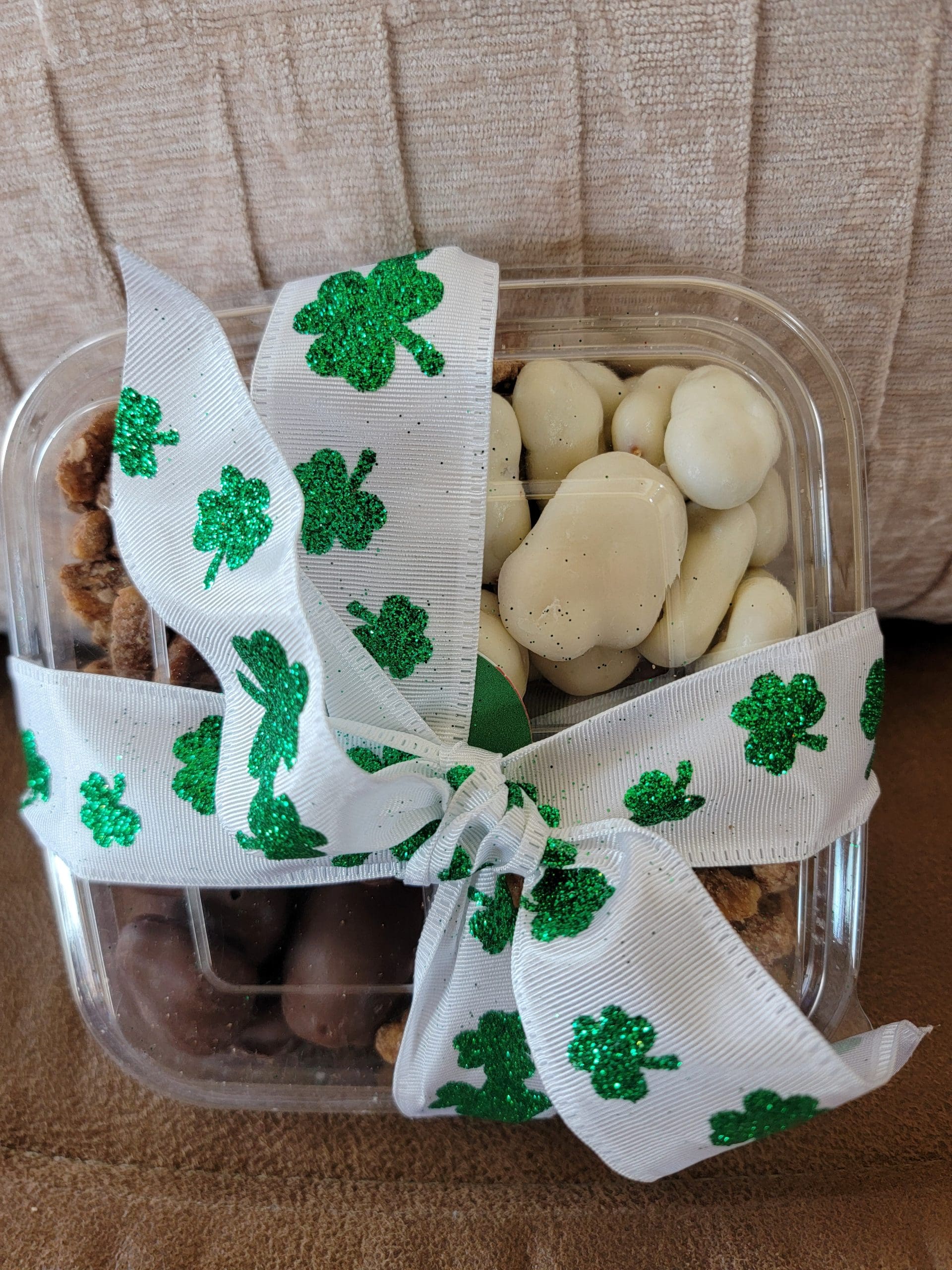 White chocolate covered pecans, milk chocolate covered pecans, and choice of 2 flavored pecans. $22.50. Ribbon color will vary.